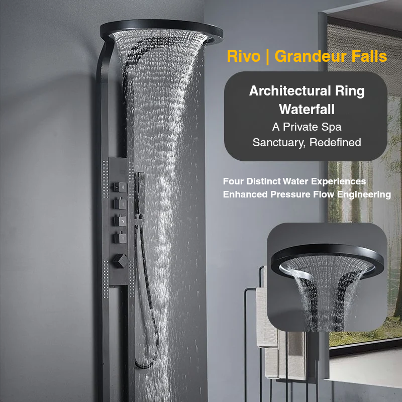 Rivo Grandeur Falls transforms the bathroom into a private spa pavilion — where water cascades from a sculpted 550mm ring in a seamless, curtain-like flow.