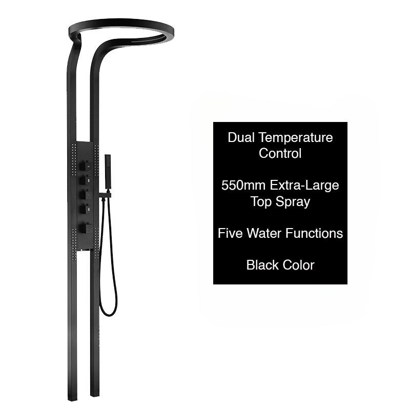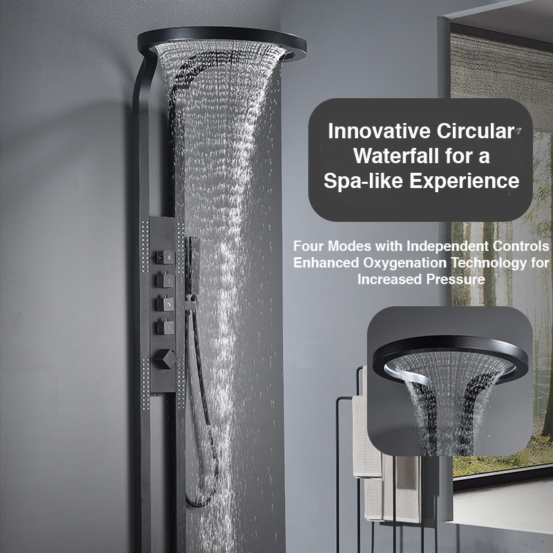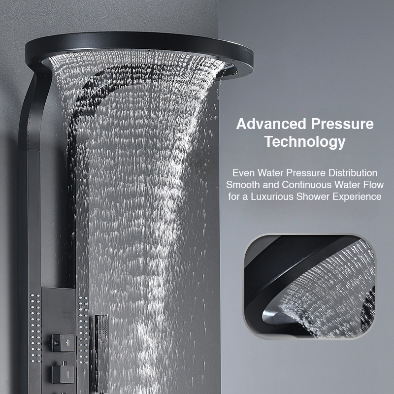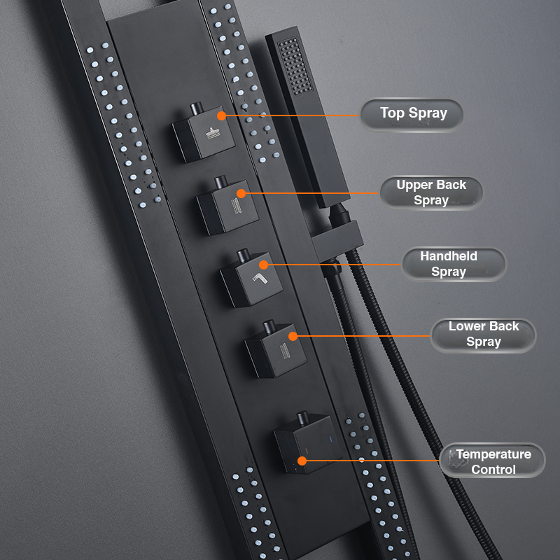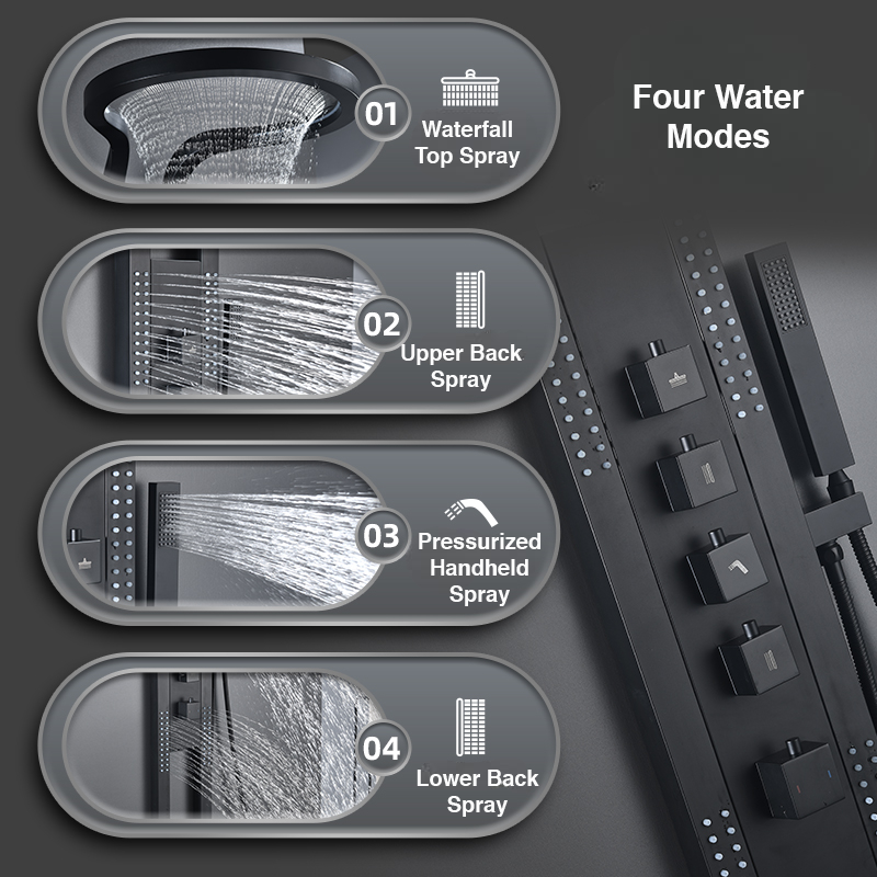 五种多功能水模式:从五种不同的水功能中进行选择,包括瀑布顶喷、上背部喷、加压手持喷、下背部喷和同时操作模式,以获得全面的淋浴体验。