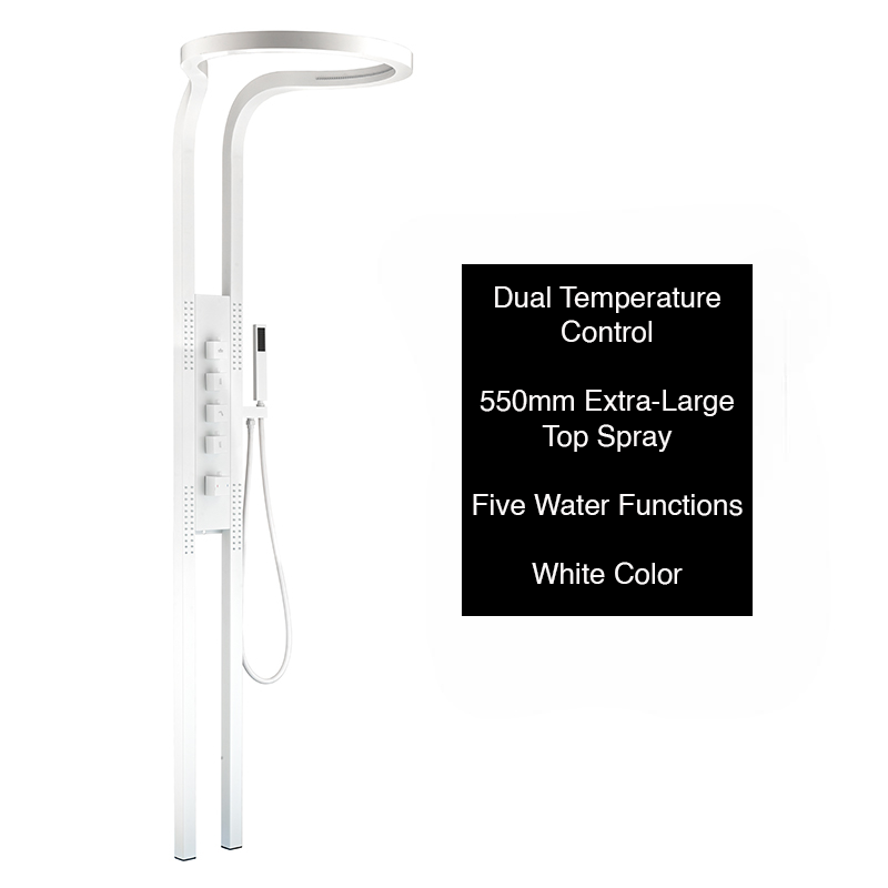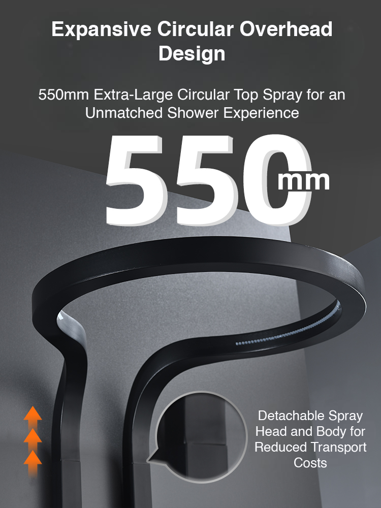 先进的超级圆顶环顶喷设计: 550毫米圆形顶喷提供无与伦比的淋浴体验,而可拆卸的喷头和机身确保易于安装并降低运输成本。