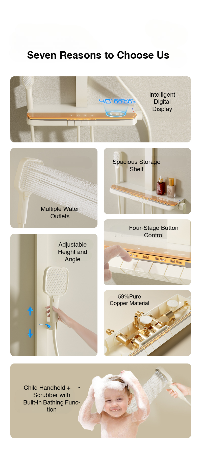 - 儿童友好功能:儿童手持淋浴器和内置擦洗功能为有小孩的家庭提供了更大的便利性和安全性。