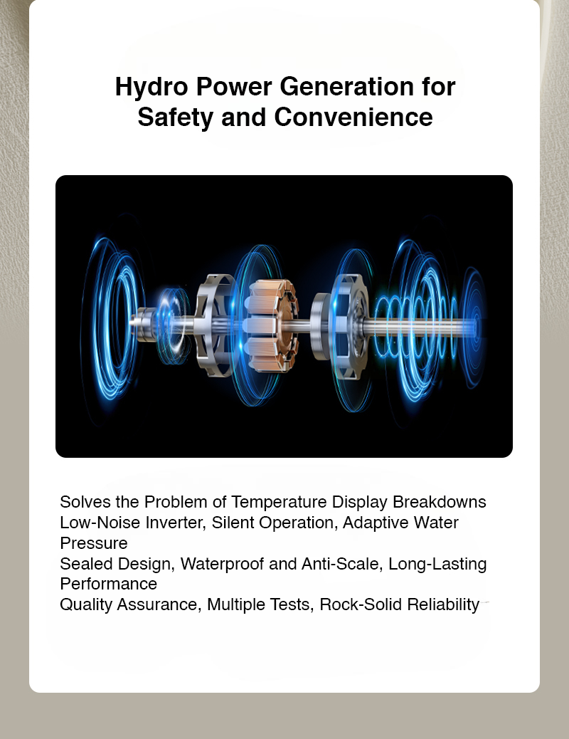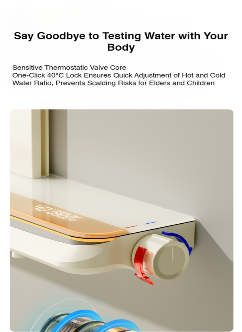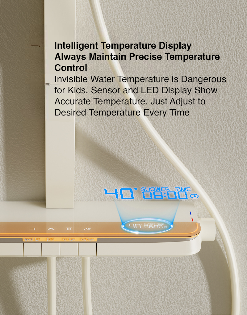 - 智能数字显示:直观的 LED 显示屏提供精确的温度读数,确保您始终享受完美的淋浴。温度传感器可快速将水温调节到您想要的设置,为所有用户(尤其是儿童和老人)提供安全保障。