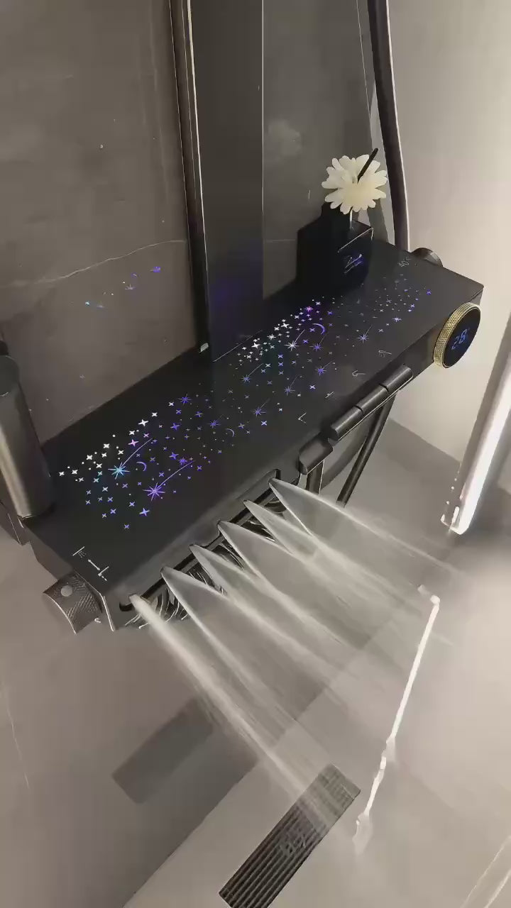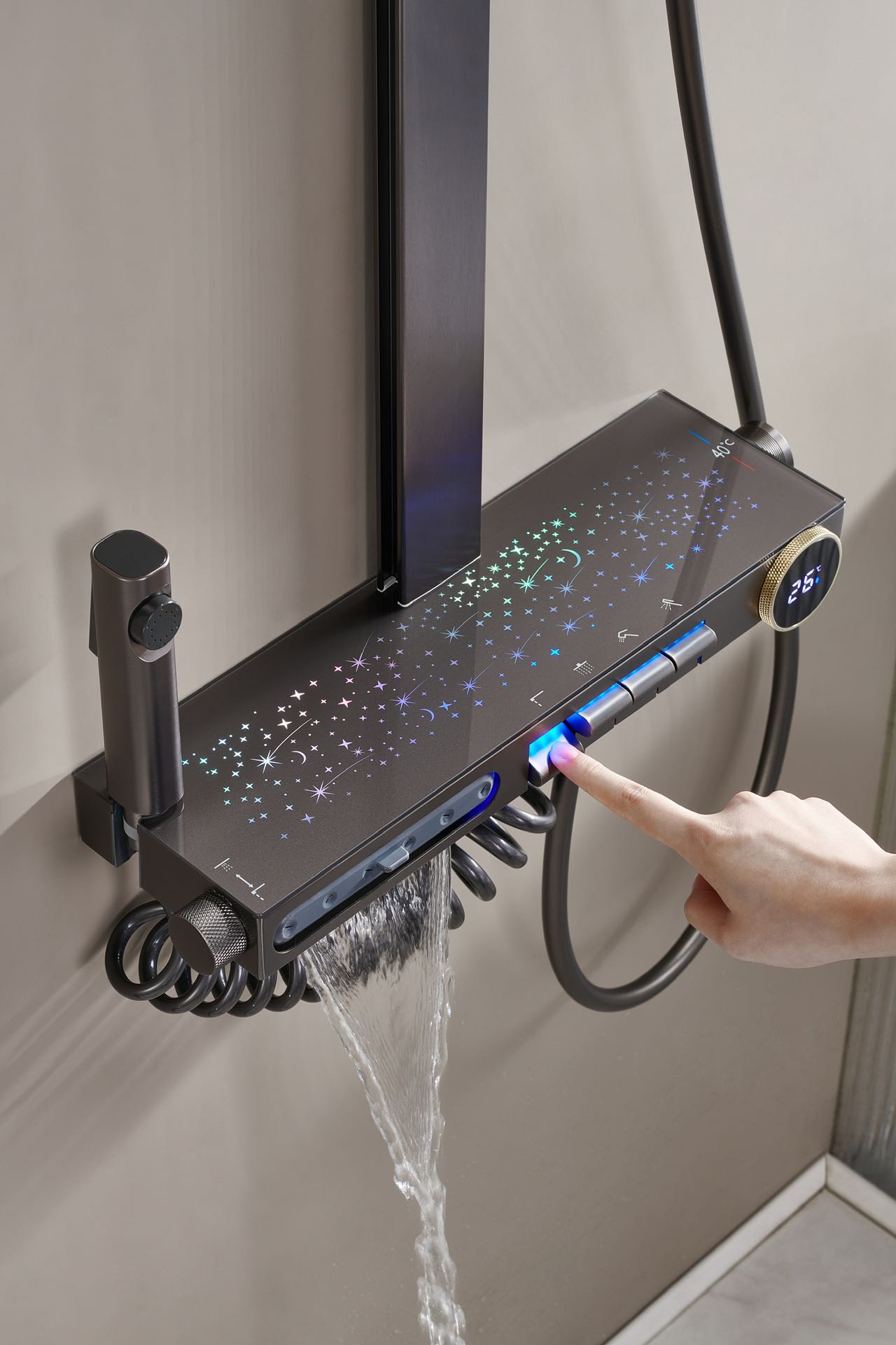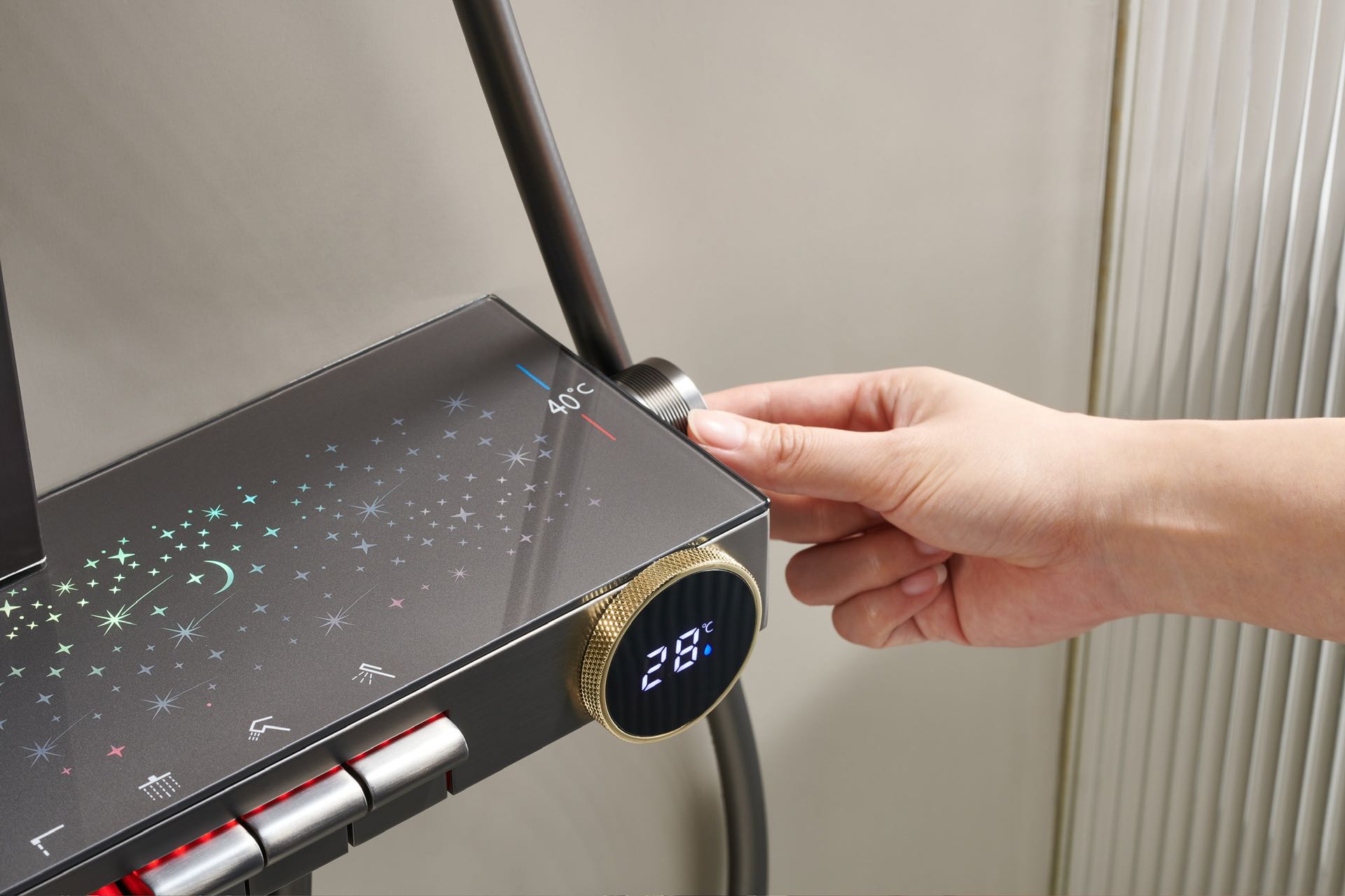 1. 星空 LED 显示屏:控制面板上的星光图案增添了令人惊叹的视觉元素,根据水温改变颜色,让每次淋浴都感觉像是一场星空之旅。发光显示屏不仅具有美观作用,还可以显示当前设置,以便于调整。
