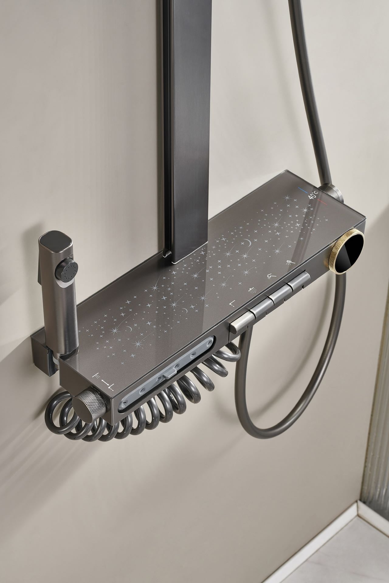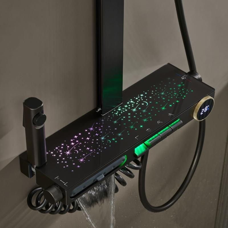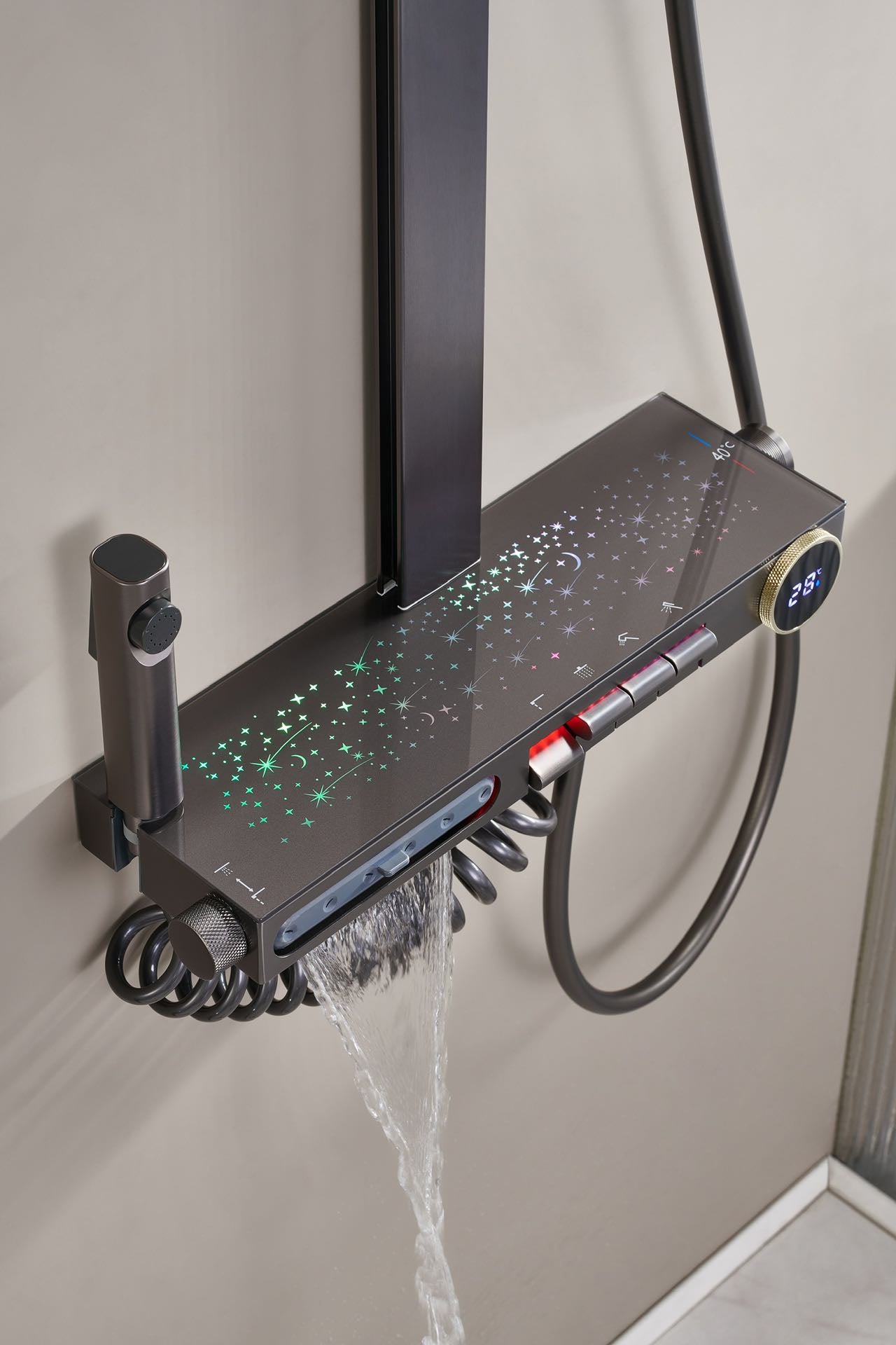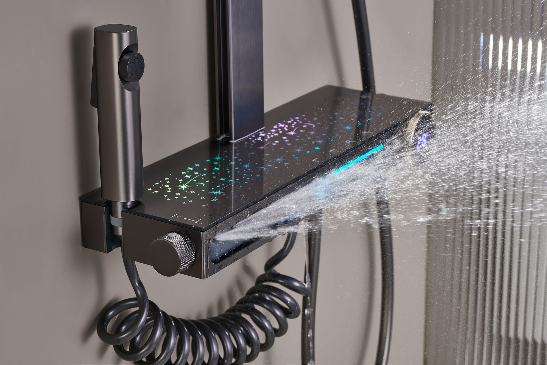1. 星空 LED 显示屏:控制面板上的星光图案增添了令人惊叹的视觉元素,根据水温改变颜色,让每次淋浴都感觉像是一场星空之旅。发光显示屏不仅具有美观作用,还可以显示当前设置,以便于调整。